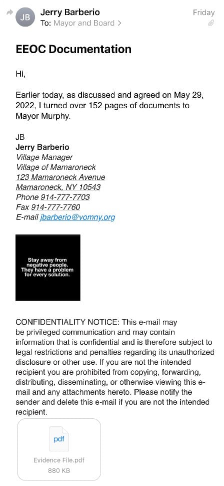 Barberio filed a complaint with the New York State Division Of Human Rights dated November 19, 2021. He asked the complaint be presented to the U.S. Equal Employment Opportunity Commission. In the complaint he named the Village of Mamaroneck and Mayor Thomas Murphy, Deputy Mayor Kelly Wenstrup, Trustee Victor Tatur, Trustee Mora Lucas and Trustee Dan Natchez as those who discriminated against him.