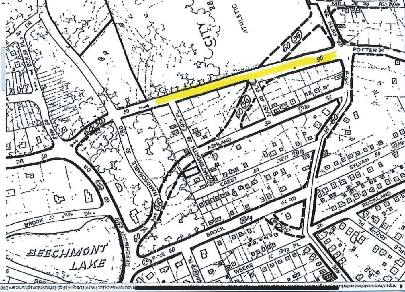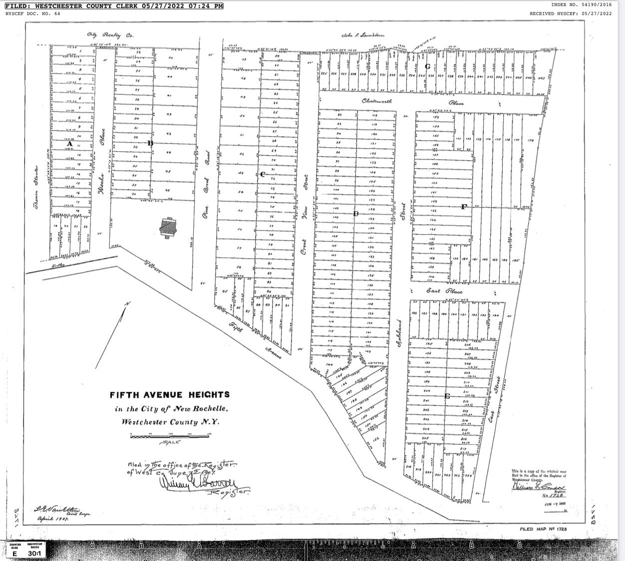 A map of Fifth Avenue Heights was filed with the Register of Westchester (the Westchester County Clerk) on June 7, 1907. The map encompasses Weeks Place, Pine Brook Road, Crest View Street, Ashland Street, Chatsworth Place, East Place and East Road. After the development was completed, Hadert Realty Company filed an Indenture with the Westchester County Clerk on April 30, 1914, to establish the streets identified in the map as public streets.