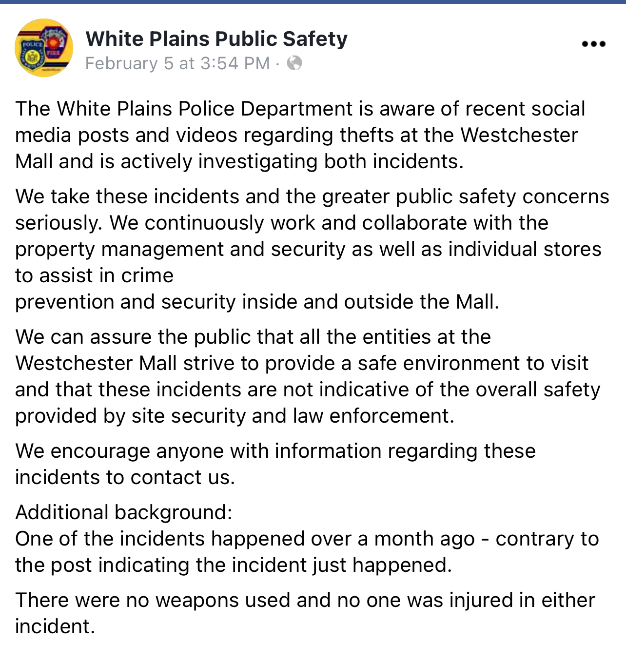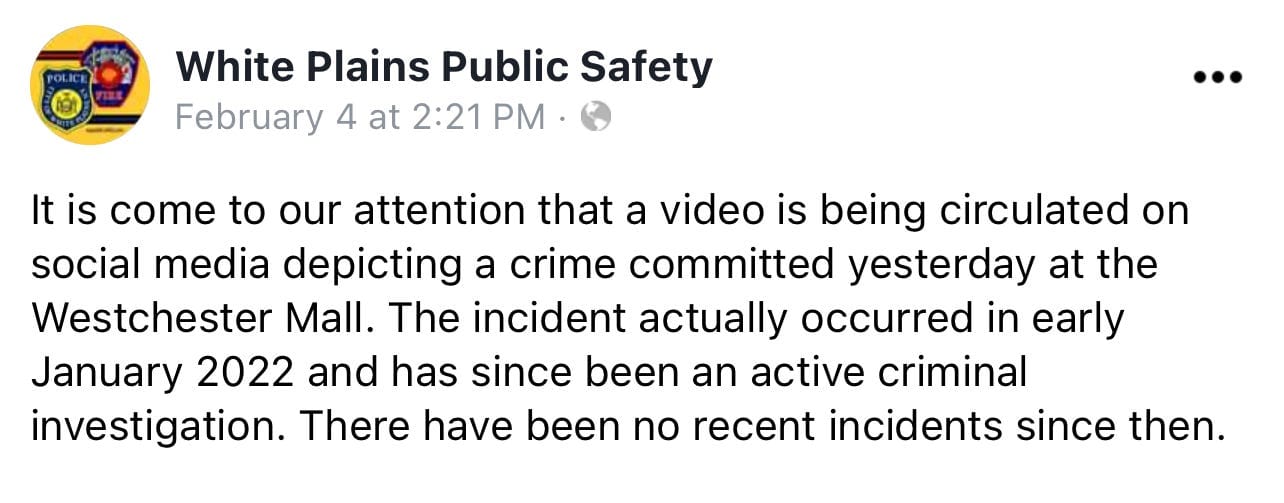 Seven minutes later, at 2:21 pm on Saturday, February 4, the White Plains Police Department issued a statement saying they were aware of a video regarding a theft at the Westchester Mall, that it occurred in January that they were actively investigating the incident and there had been no incidents since January.