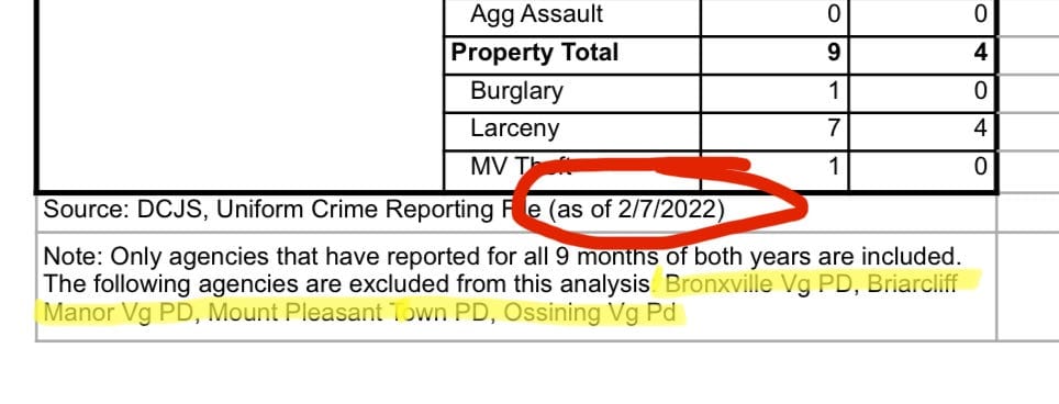 The DCJS said the data in their report is preliminary and does not include data from police departments from four municipalities: Bronxville Village, Briarcliff Manor Village, Mount Pleasant Town and Ossining Village.