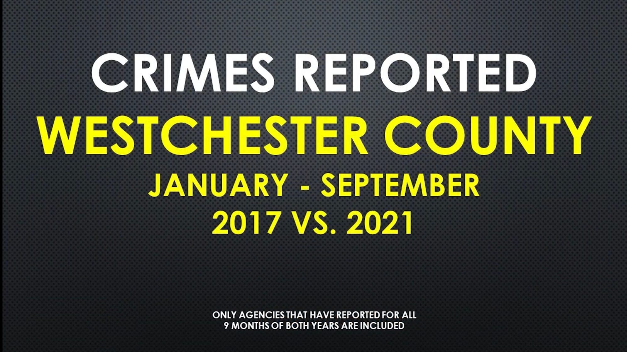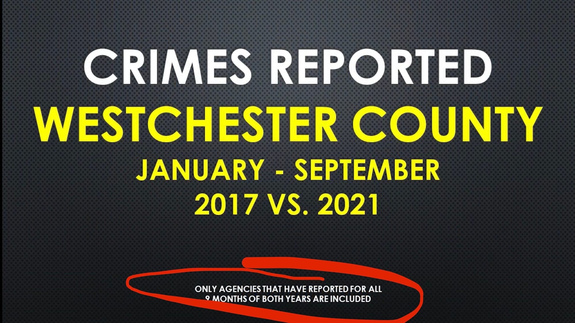 “You might have heard that crime is out of control that criminals are running rampant. But let's look at the numbers. Let's look at the facts. Because here in Westchester County, crime is down. Westchester County Department of Public Safety compared January through September 2017 versus 2021”.