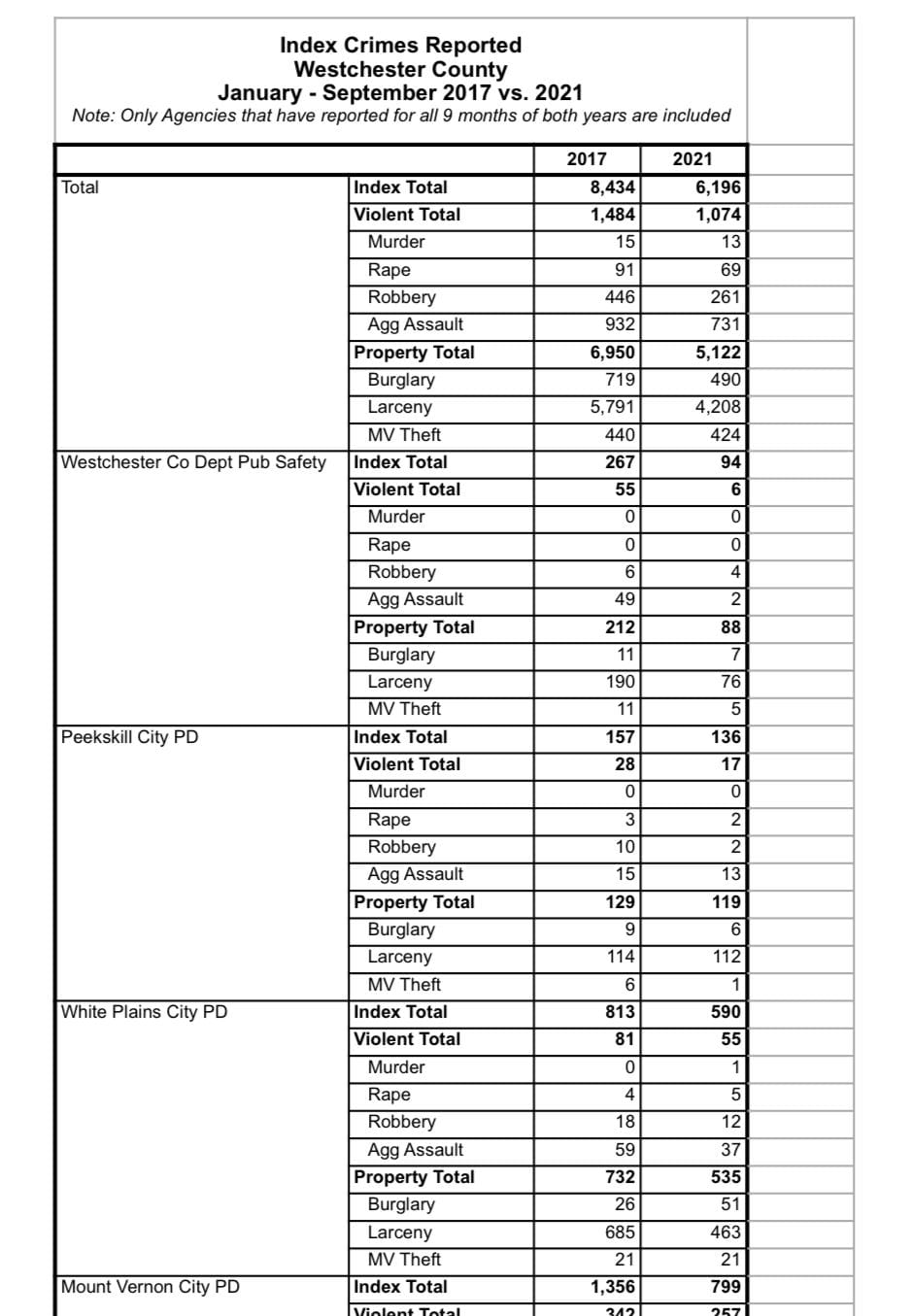 5 jurisdictions plus the Westchester County Police Department had the biggest drops in Index Crimes during the period: Mount Vernon (1,356 to 799), New Rochelle (1,020 to 653), Rye (60 to 2), White Plains (813 to 590), Yonkers (2,078 to 1,712) and Westchester County Police Department (267 to 94),