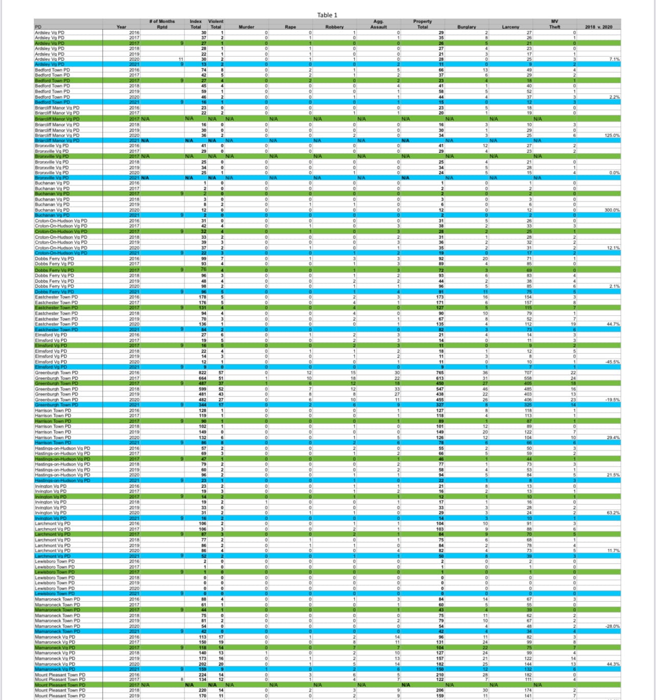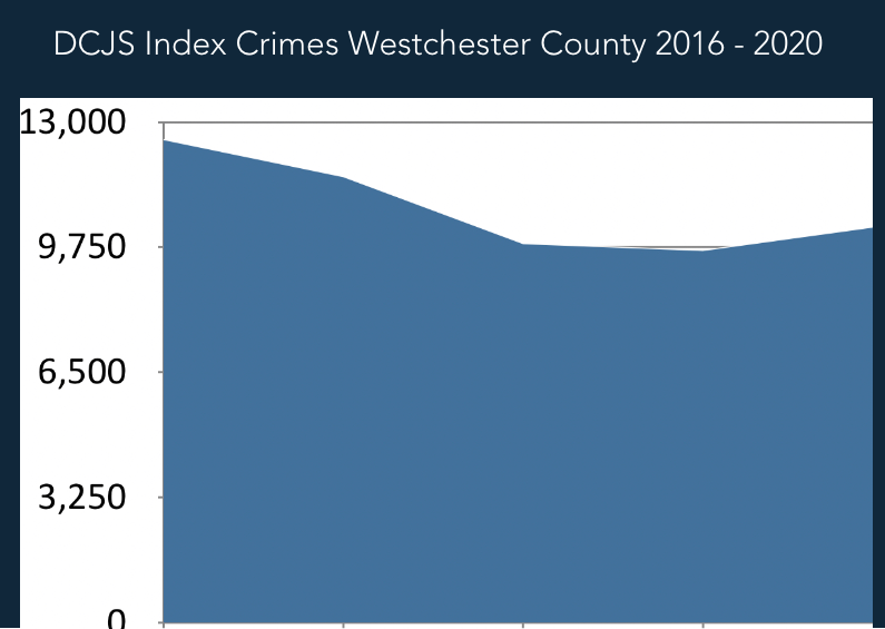 There are two sets of numbers: the Index crime statistics published annually each fall by the New York State Department of Criminal Justice Services (DCJS) and a custom report based on incomplete, preliminary, non-public data prepared by DCJS at the request of the Westchester County Executive’s Office and delivered to the Westchester County Executive’s Office on February 7, 2022.