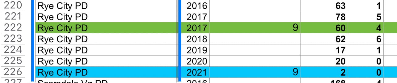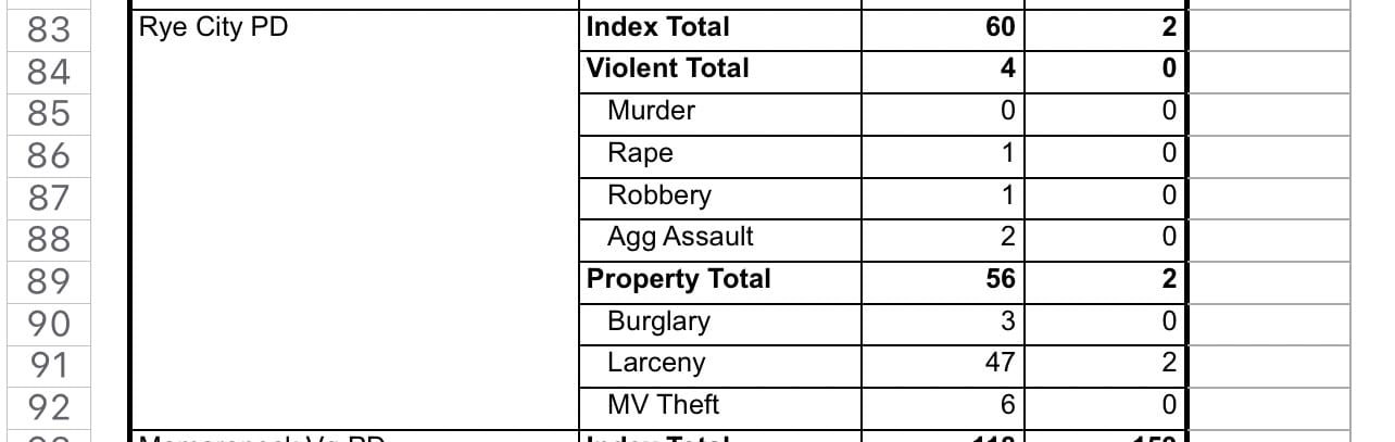 The data for Rye City PD is questionable, showing a 97% decline in Index crime, down from 60 total to just two larcenies.