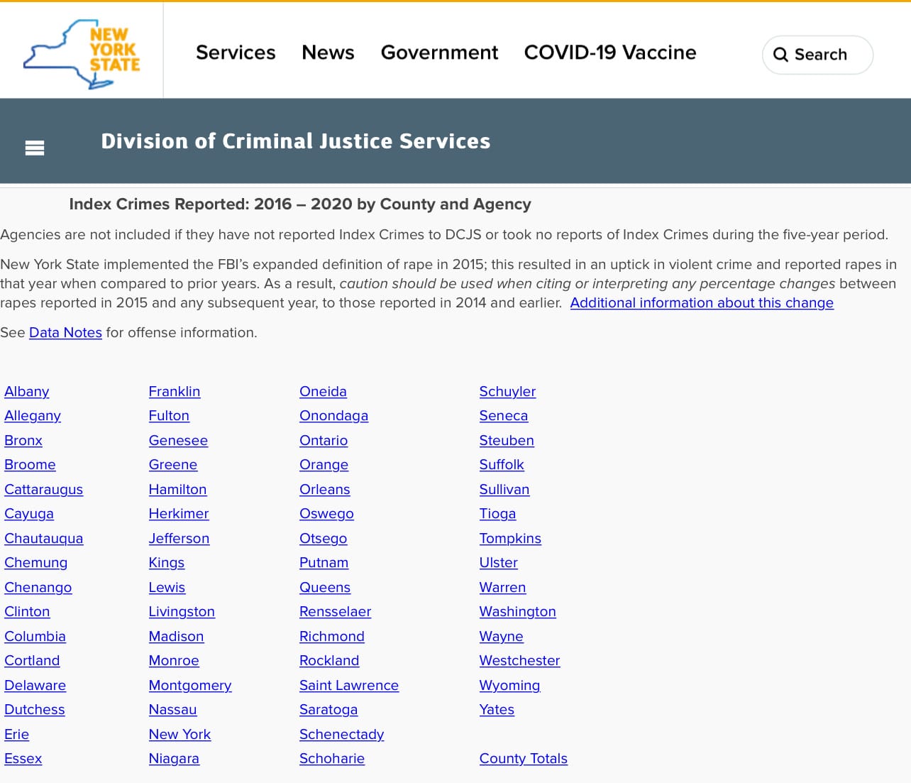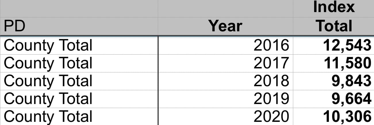 Division of Criminal Justice Services: Index Crimes Reported: 2016 – 2020 by County and Agency