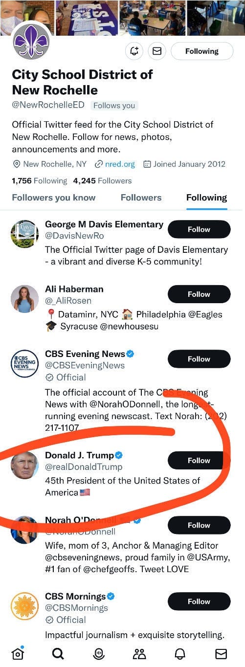 If the District were actually serious about the supposed danger of Twitter, they would fully deactivate / delete their @NewRochelleEd account not just put in on pause (again, Elon Musk is still monetizing their decades worth of tweets) and then do the same with all the related district accounts under their control like the schools, sports teams, clubs and organizations, then move on to ordering administrators and coaches publicly associated with the district to do the same and likewise for affiliated organizations.