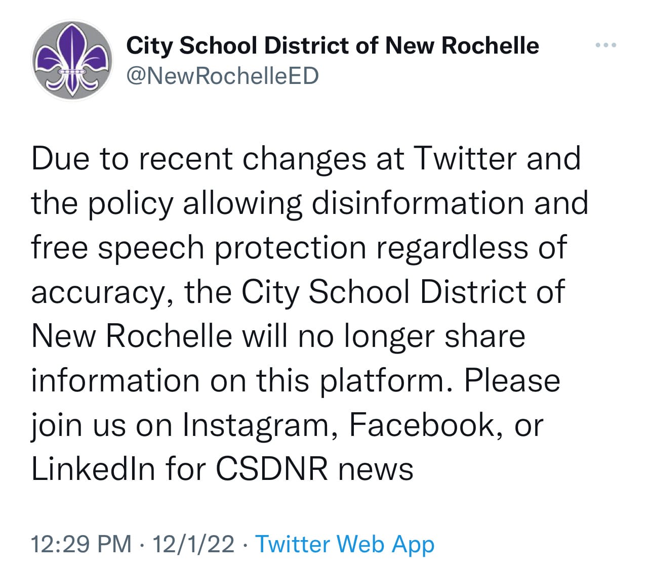As many readers know, on Thursday, the City School District of New Rochelle announced it would no longer share information on Twitter. It did not deactivate nor delete the District Twitter profile @NewRochelleEd so 10 years worth of its tweets remain published on Twitter being monetized (horrors!) by Elon Musk.