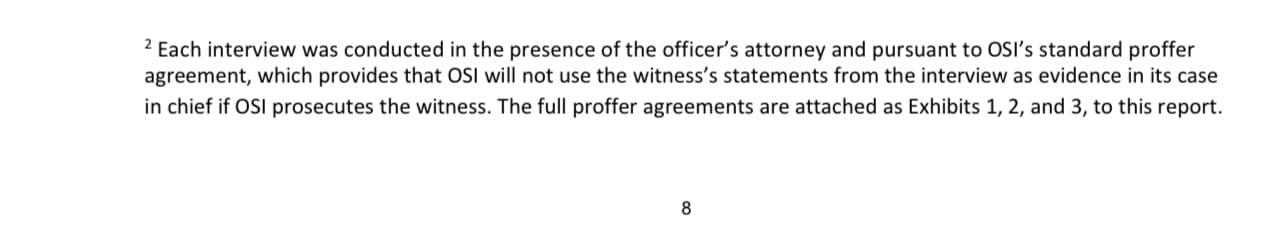 - There are documents (full proffer agreements) described in a footnote on Page 8 as attached exhibits. The footnote states: “The full proffer agreements are attached as Exhibits 1, 2, and 3, to this report.” They were removed, so were not part of the report published on the OAG website.