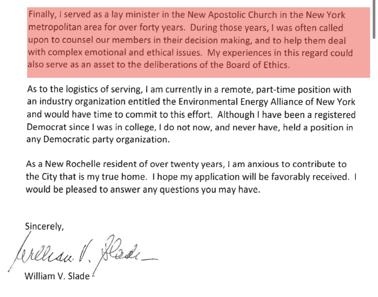 Given its unaddressed Nazi history, I was surprised to learn that William V. Slade, a preacher or “lay minister” in this church since the 1980s, was appointed to the New Rochelle Board of Ethics. I’m just laying out the facts—you decide what to make of them. For more context, check out my two articles and a screenshot of Slade’s cover letter for the board position. What do you think?