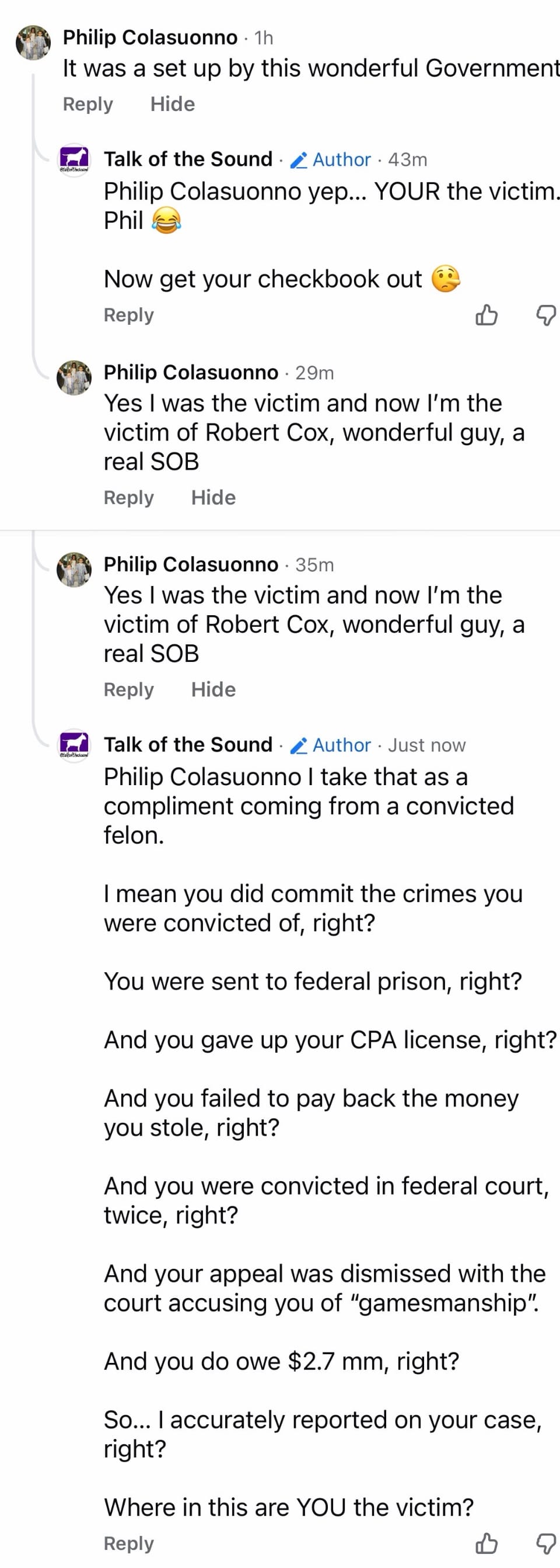 Phil Colasuonno was not happy to not squirm free from what is now a $2.7 mm IRS tax debt so he took my Facebook Page to paint himself as the victim (of the IRS and me)