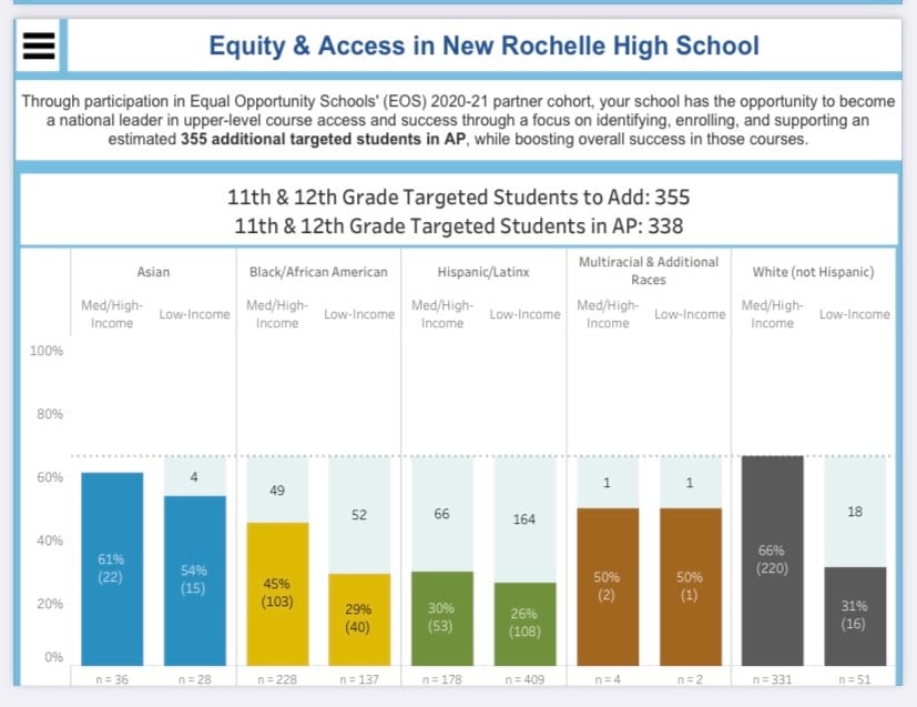 The data is the only time I have seen New Rochelle High School AP enrollment data broken down by race/ethnicity AND income as it should be.