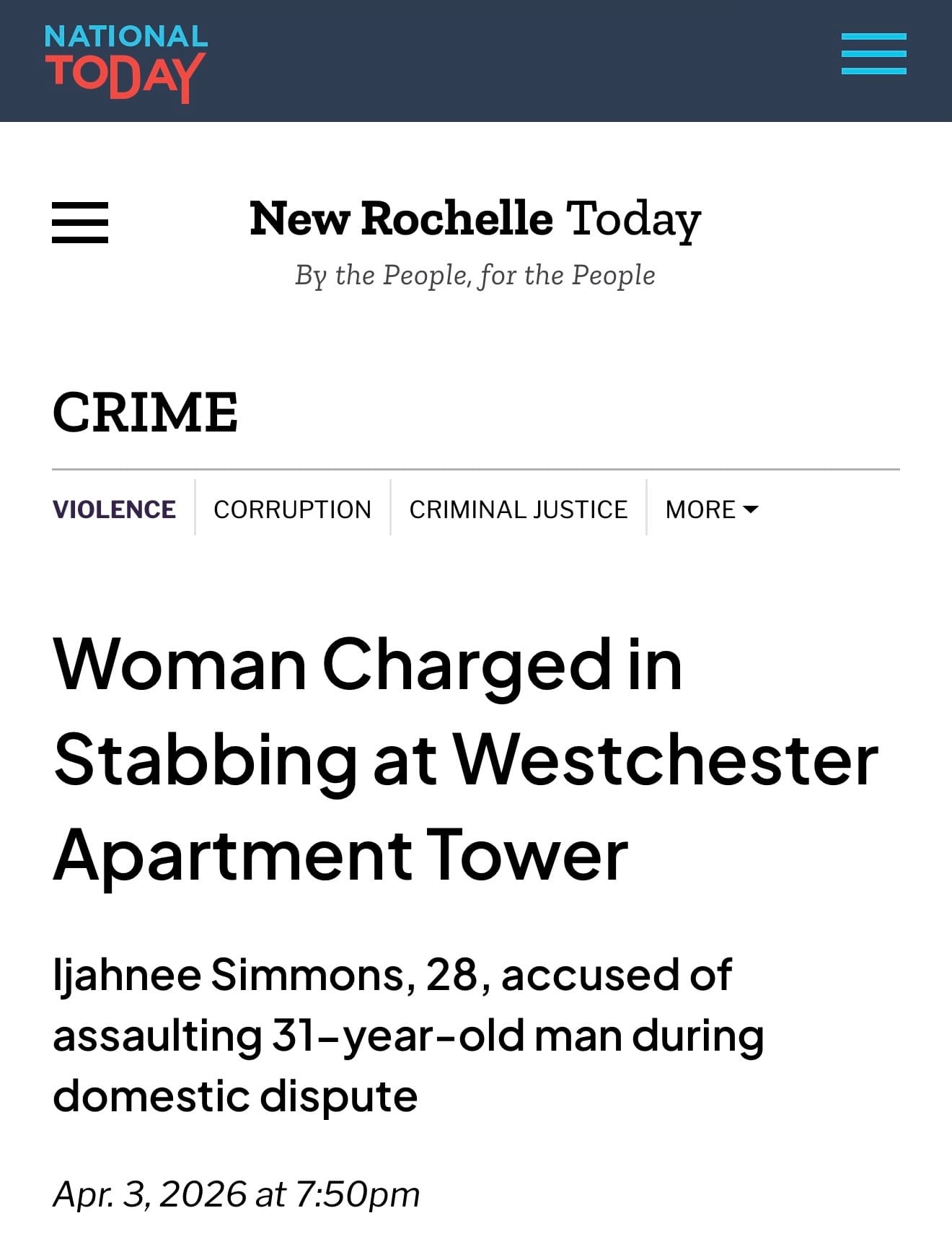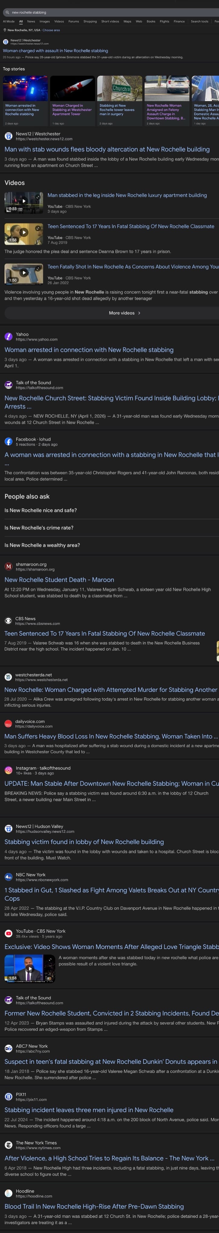 On April 5, I was reviewing Google search results on the New Rochelle stabbing to see if there was anything I had missed—any additional reporting, details, or follow-up.