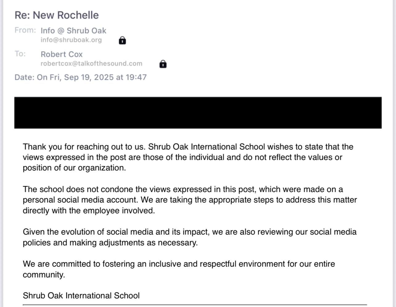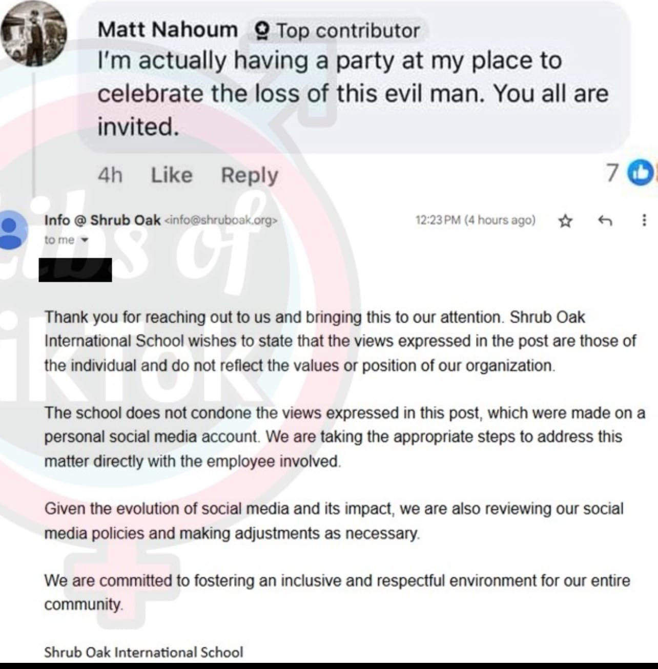 Thank you for reaching out to us and bringing this to our attention. Shrub Oak International School wishes to state that the views expressed in the post are those of the individual and do not reflect the values or position of our organization. The school does not condone the views expressed in this post, which were made on a personal social media account. We are taking the appropriate steps to address this matter directly with the employee involved. Given the evolution of social media and its impact, we are also reviewing our social media policies and making adjustments as necessary. We are committed to fostering an inclusive and respectful environment for our entire community.