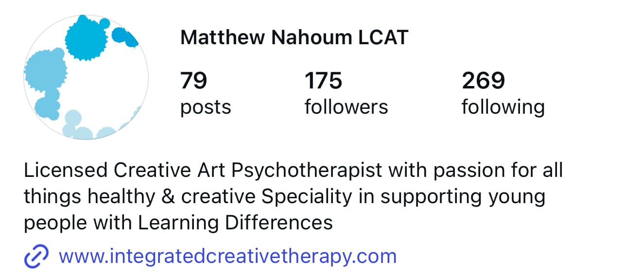 Matt Nahoum apparently runs Integrated Creative Therapy, where he integrates CBT, ACT, arts therapy, and mindfulness for clients of all ages. The website says: