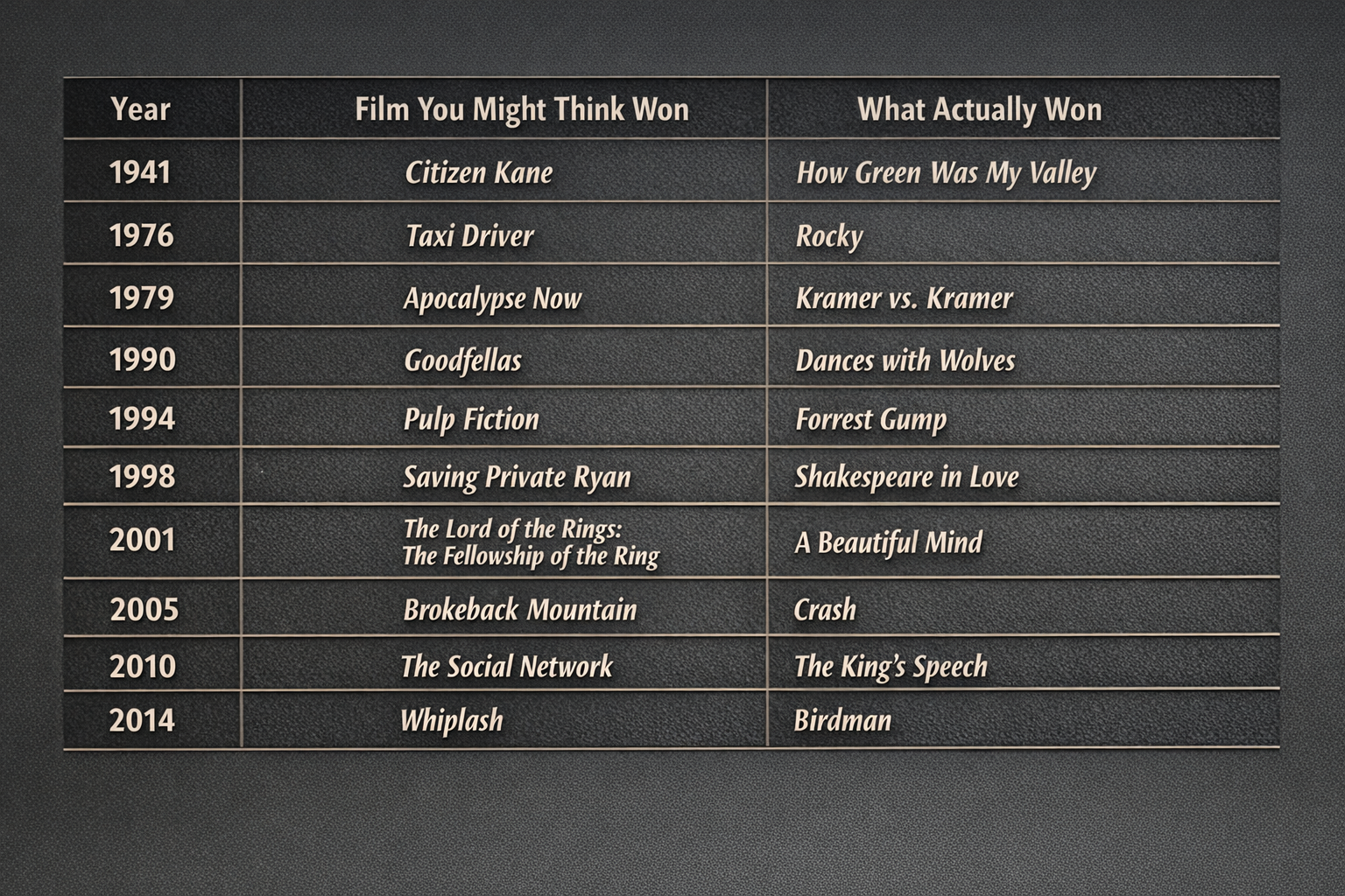 Looking down the list, the pattern becomes hard to ignore. In 1941, Citizen Kane lost to How Green Was My Valley. In 1976, Taxi Driver lost to Rocky. In 1979, Apocalypse Now lost to Kramer vs. Kramer. In 1990, Goodfellas lost to Dances with Wolves. In 1994, Pulp Fiction lost to Forrest Gump. In 1998, Saving Private Ryan lost to Shakespeare in Love. In 2001, The Lord of the Rings: The Fellowship of the Ring lost to A Beautiful Mind. In 2005, Brokeback Mountain lost to Crash. In 2010, The Social Network lost to The King’s Speech. And in 2014, Whiplash lost to Birdman.