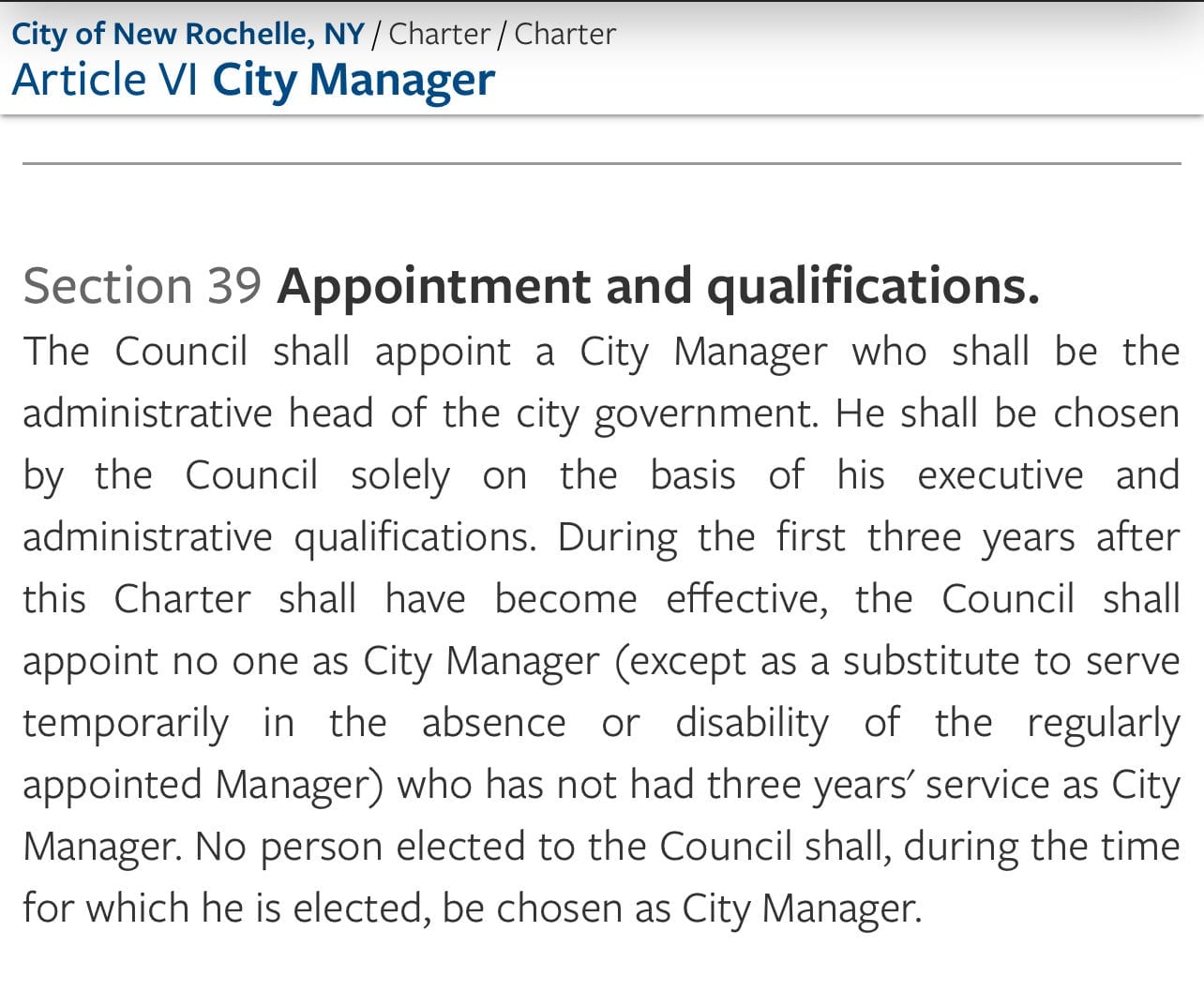 Q. Now, I just want to make sure I understand, in terms of what are requisite qualifications to be the city manager in the city of New Rochelle. Am I correct that the inquiry starts with Section 39 of the charter, and then, consistent with that, more details are developed as you prepare to make a search for the new city manager?