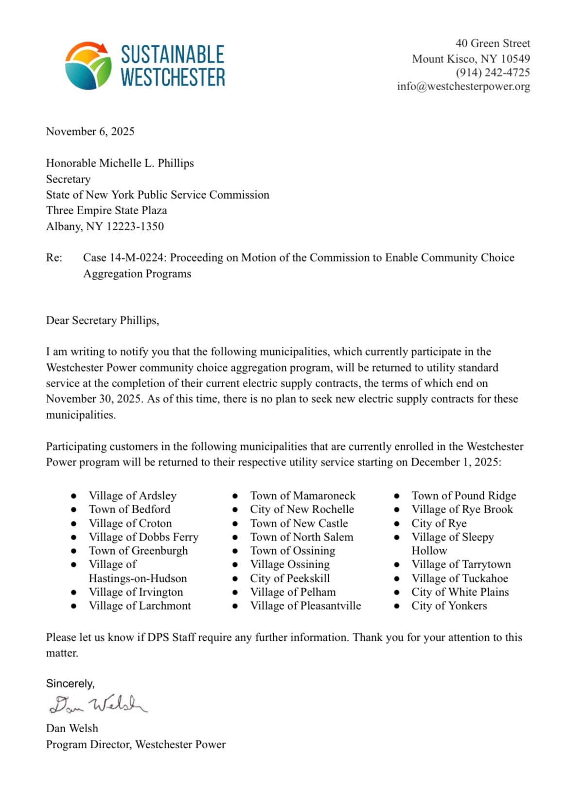- Sustainable Westchester Pulls Plug on Power Program in Official Letter to Municipalities (11/8/2025)