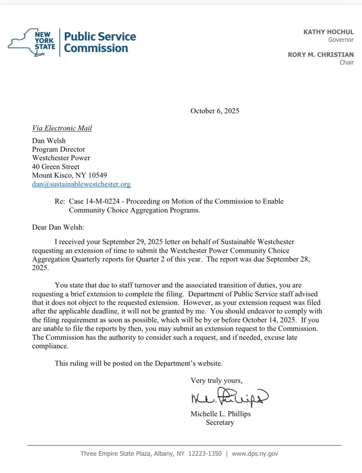 Sustainable Westchester also missed a Sept. 28, 2025, deadline to file a quarterly report. A request for an extension filed Sept. 29 was denied by PSC Secretary Michelle L. Phillips on Oct. 6, 2025, with a new deadline of Oct. 14.