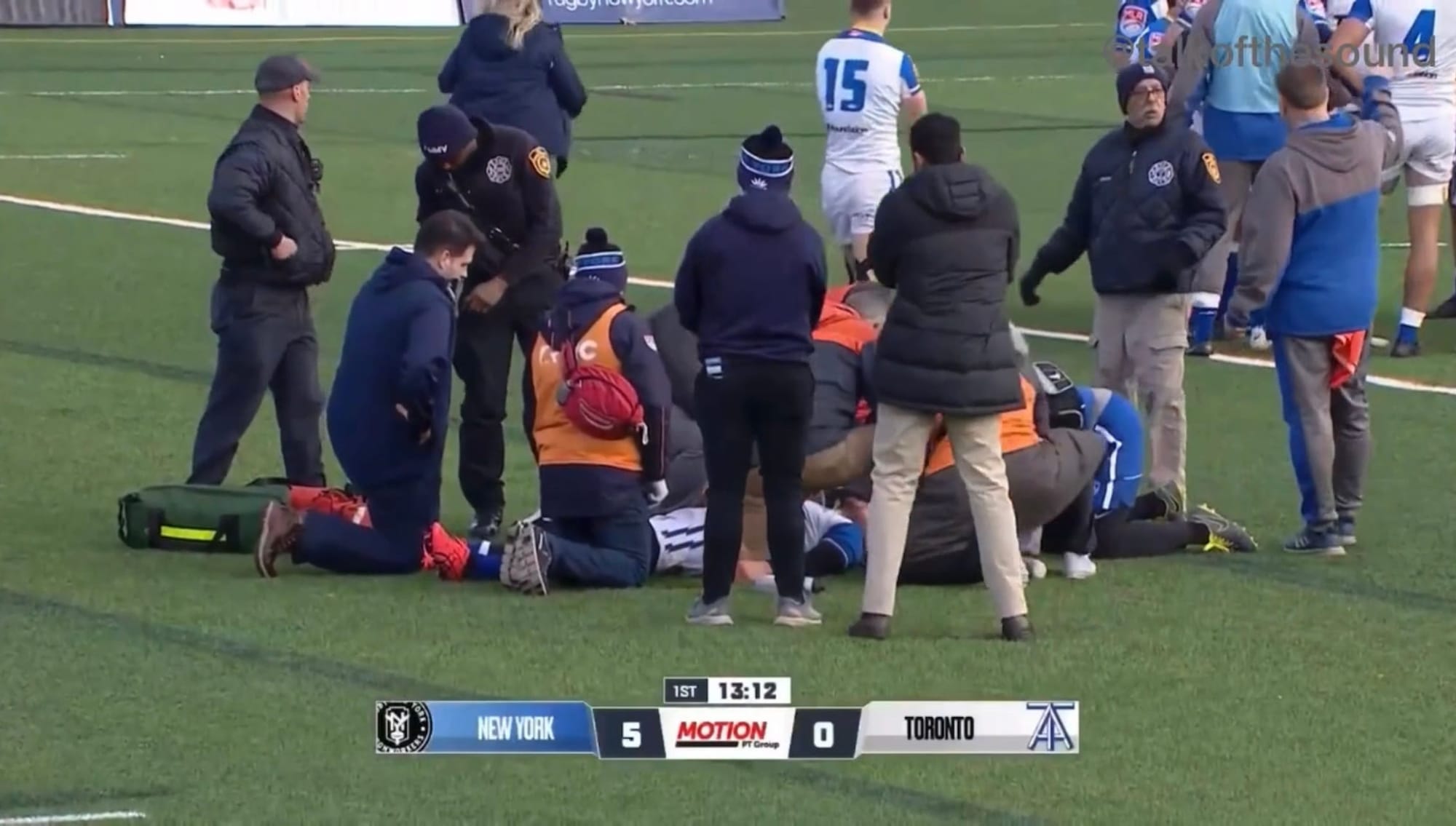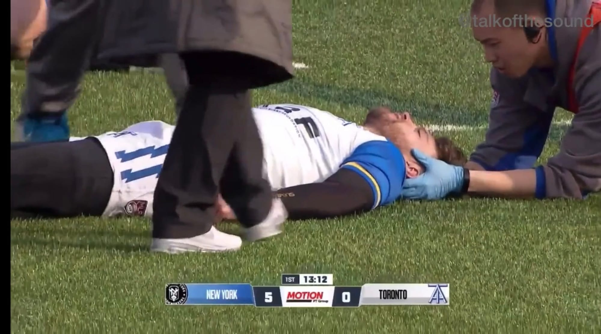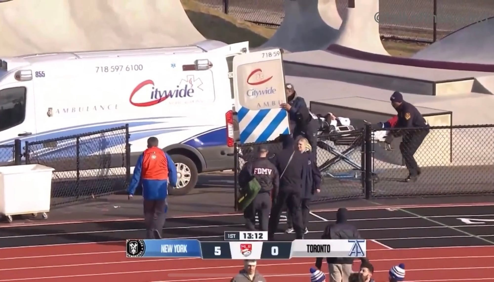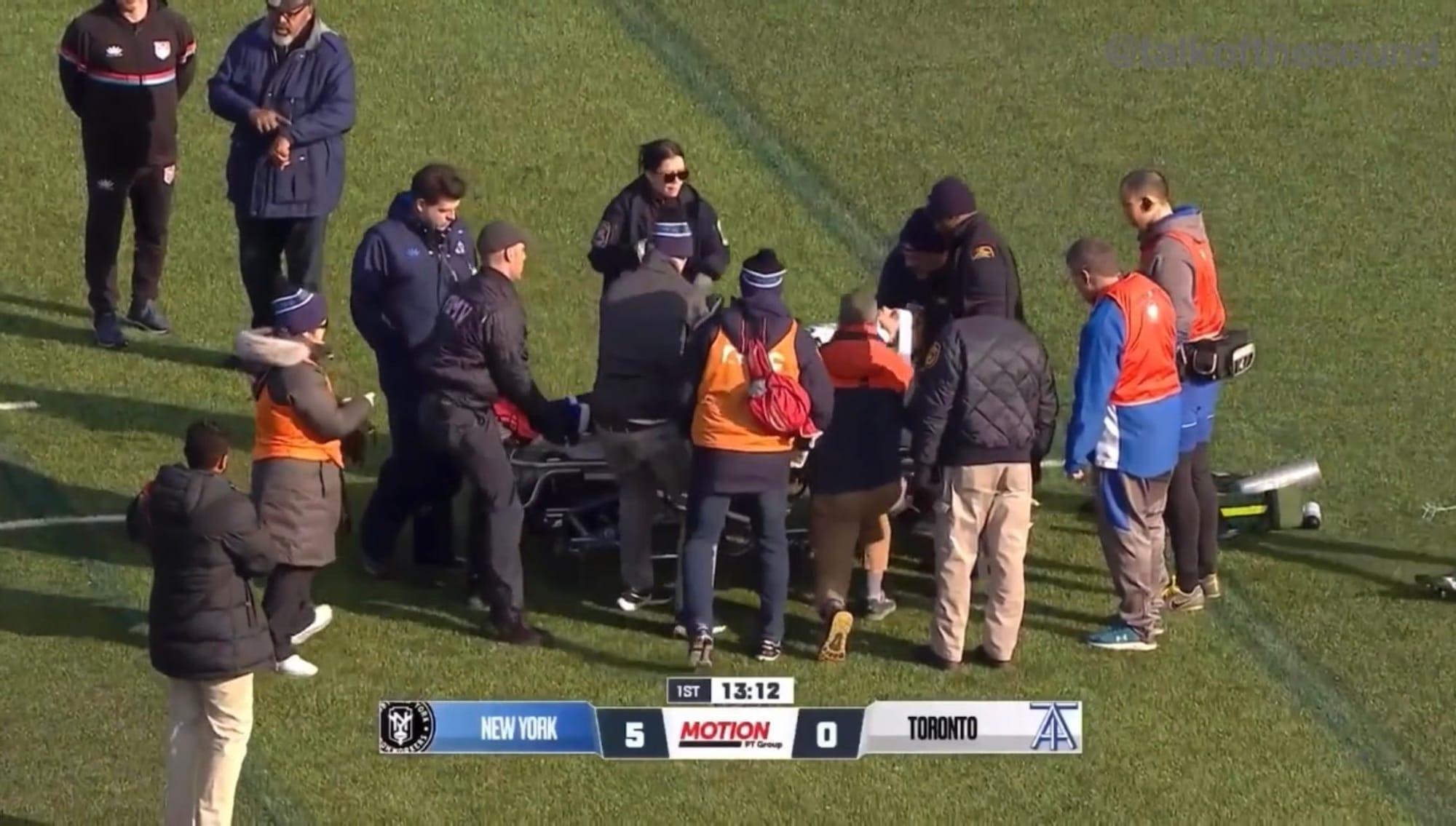 At 13:12 into the match, a short New York kick resulted in two Toronto players colliding with one, Cole Davis, suffering a serious injury that required he was removed from the field (called “the pitch”). Play was stopped for about 15 minutes.