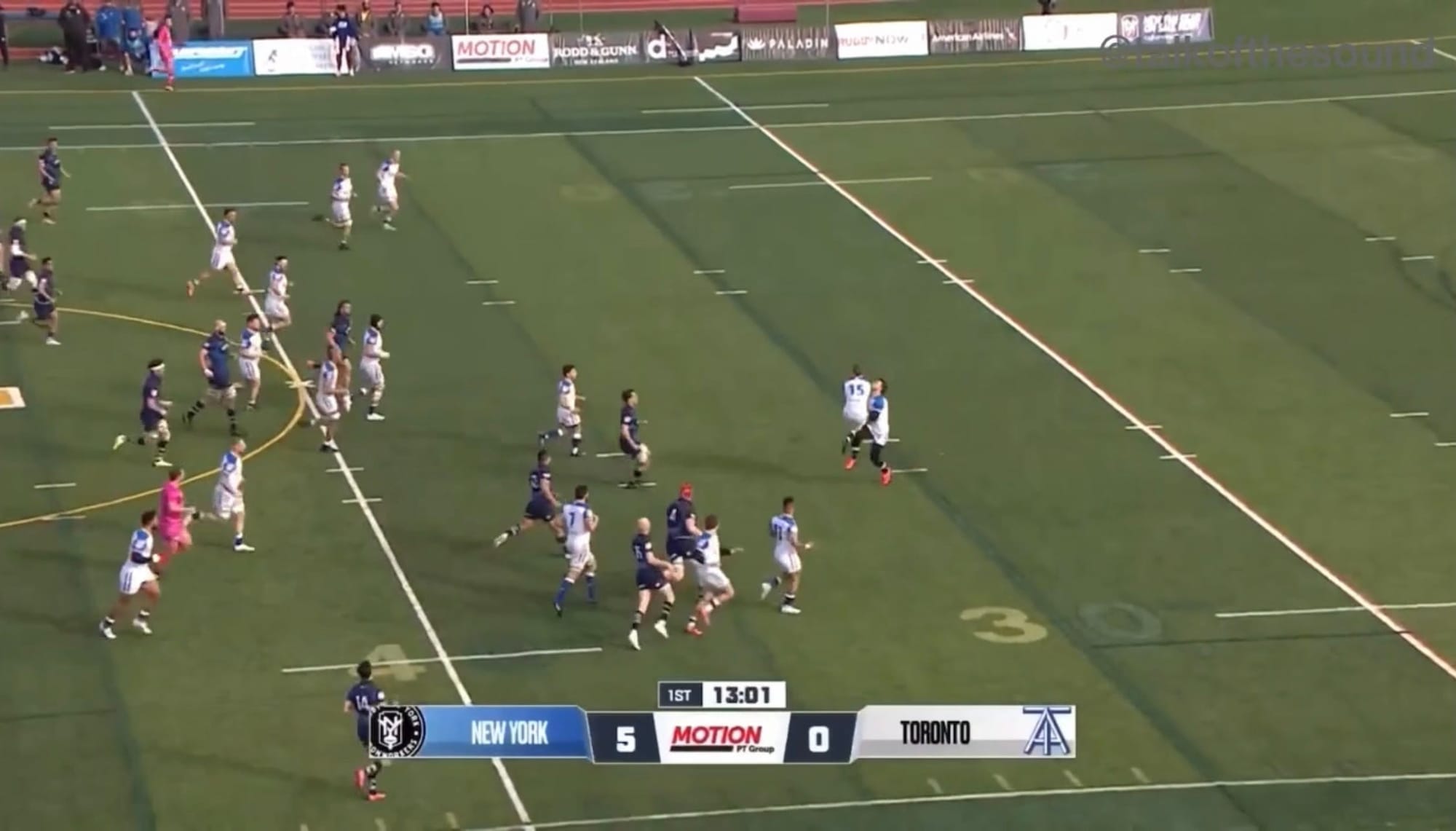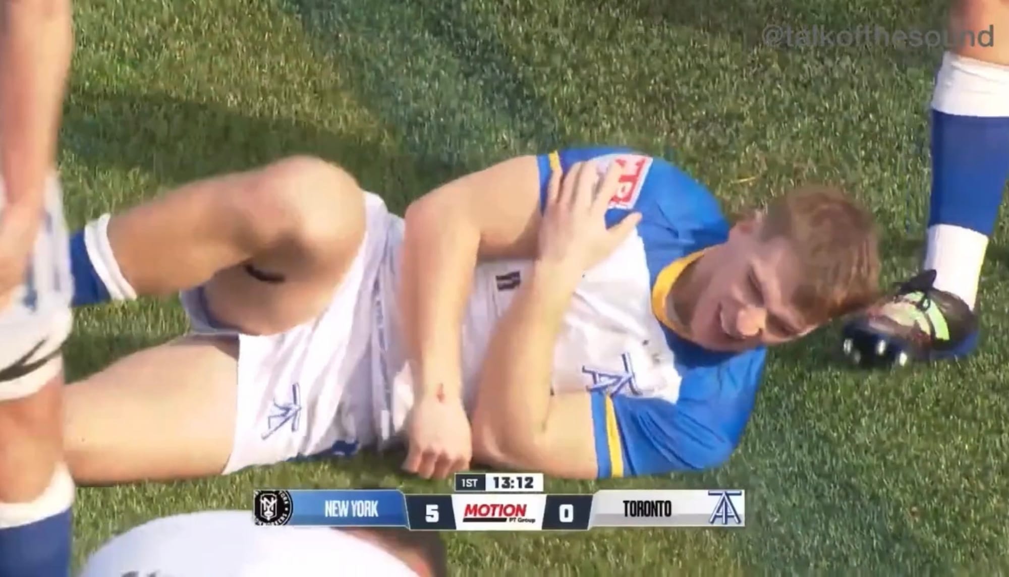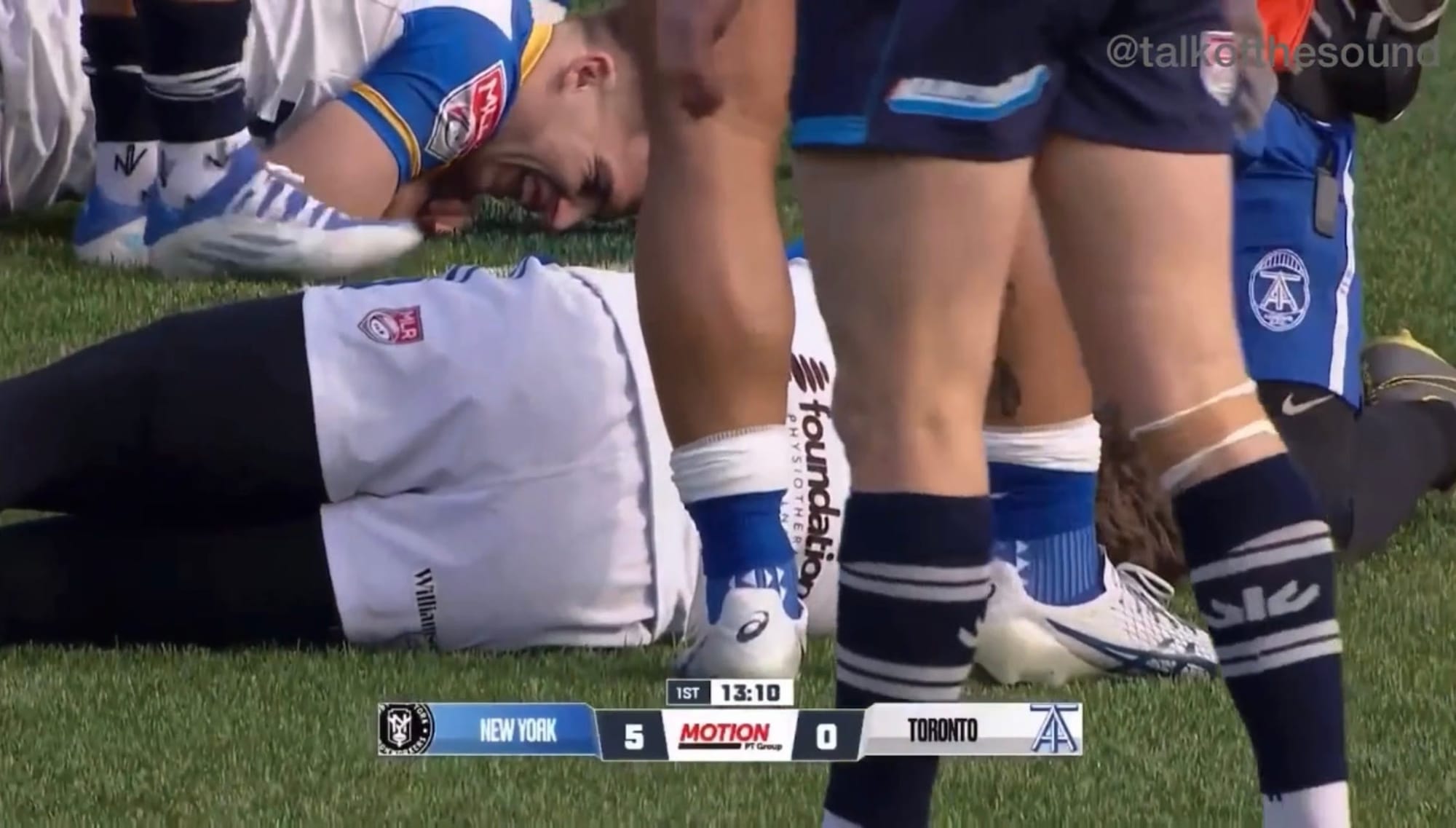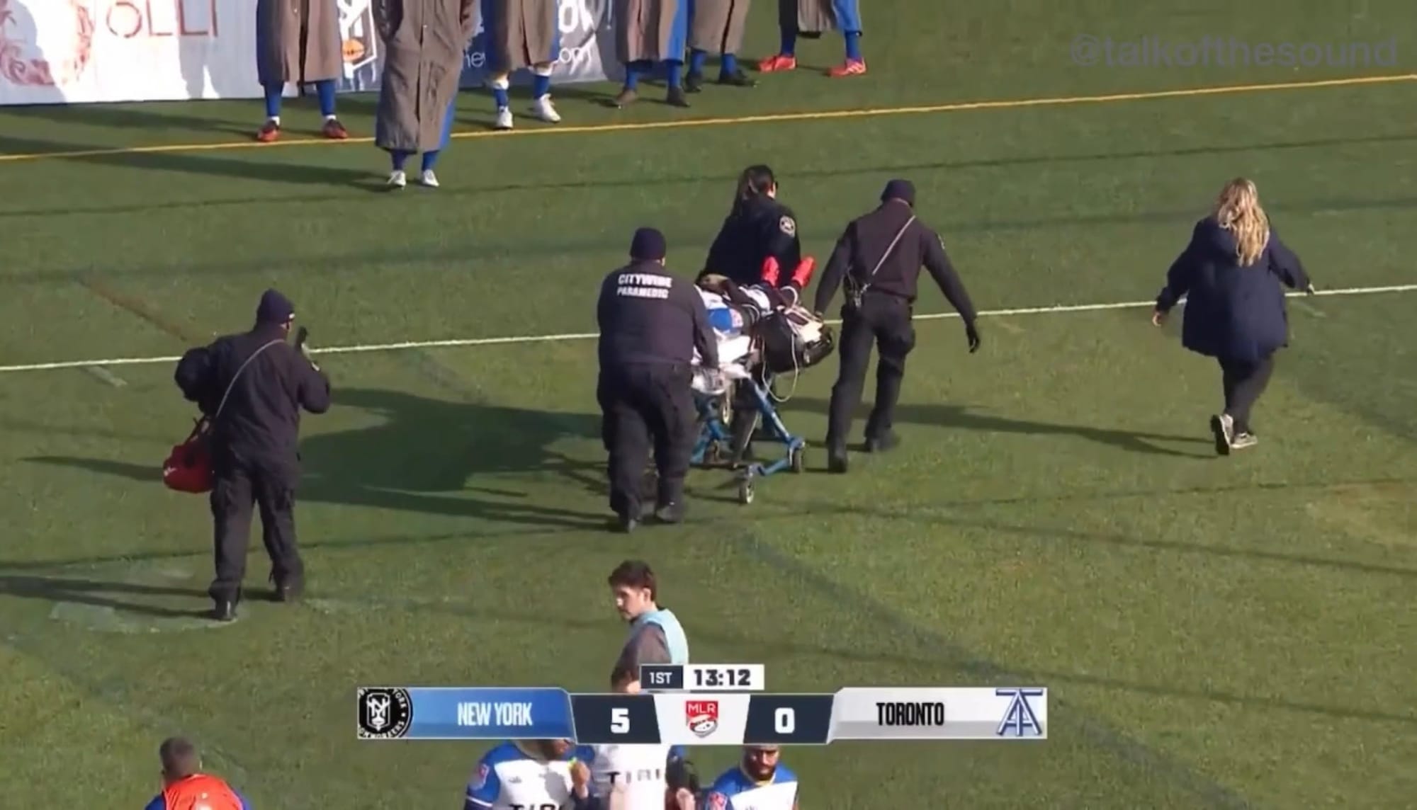 At 13:12 into the match, a short New York kick resulted in two Toronto players colliding with one, Cole Davis, suffering a serious injury that required he was removed from the field (called “the pitch”). Play was stopped for about 15 minutes.