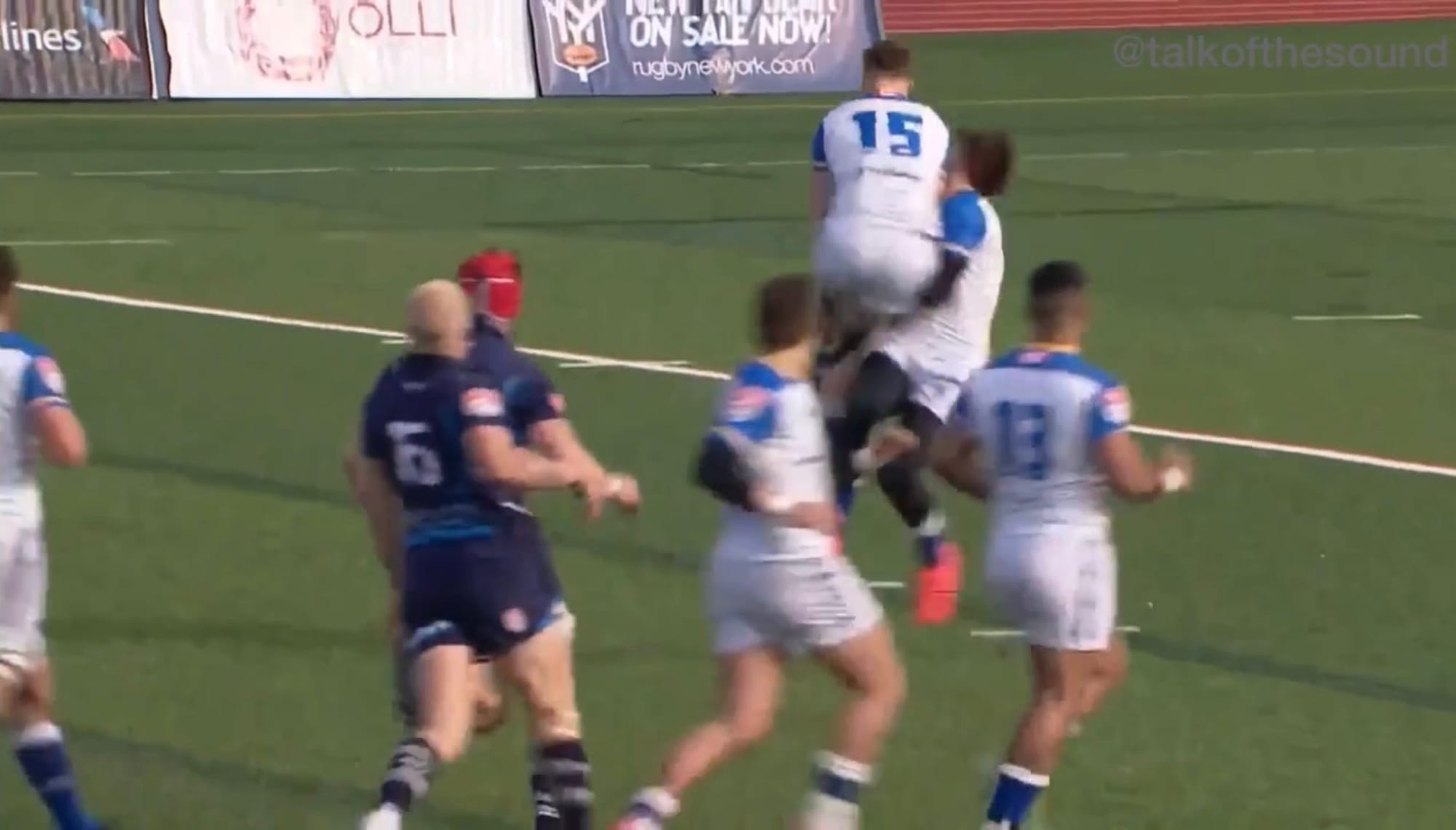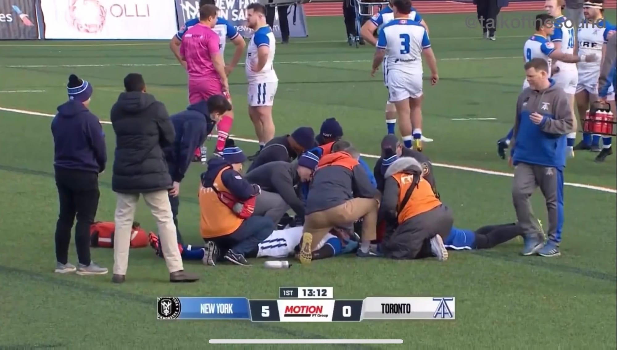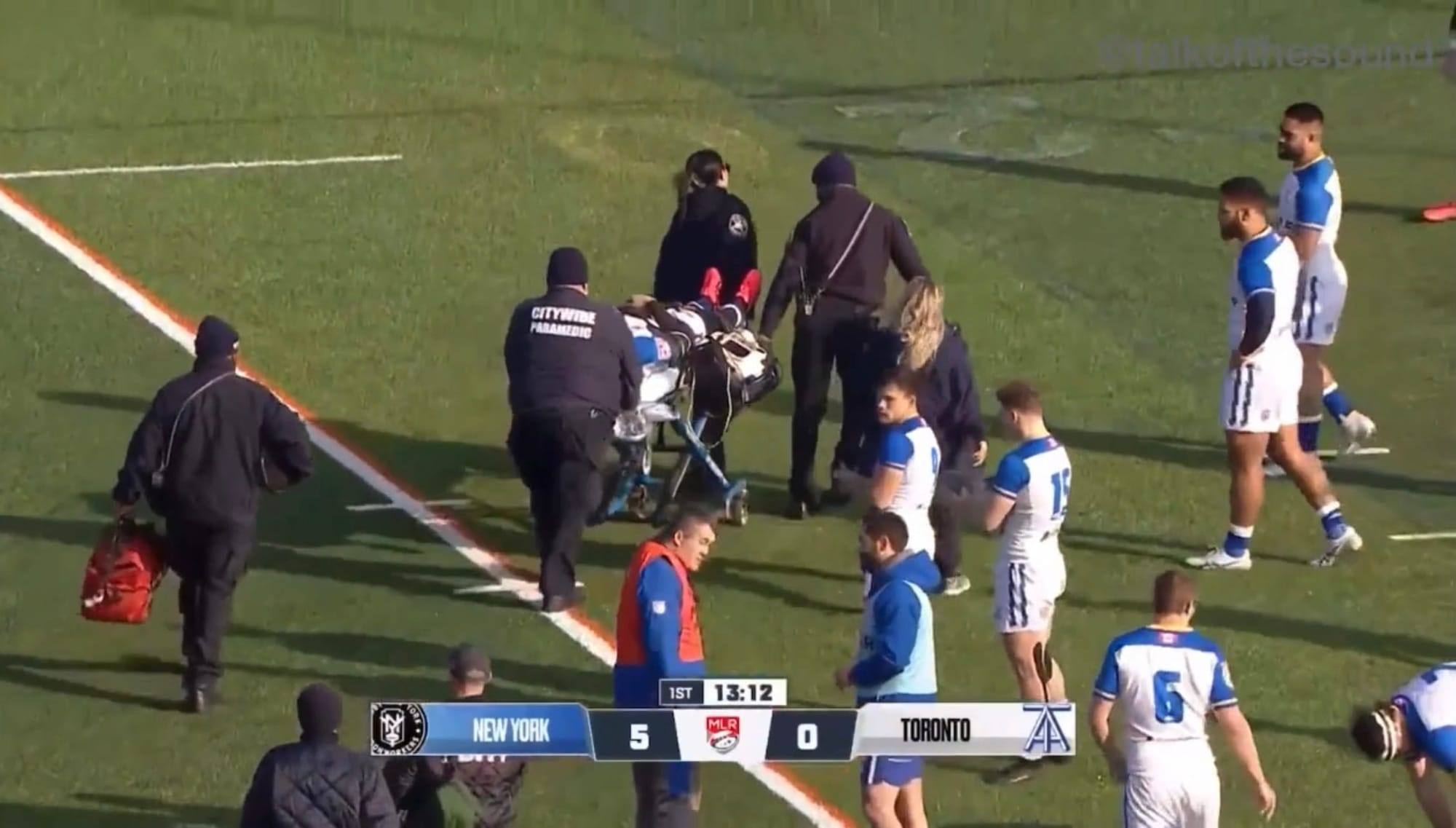 During the call, Lewis’ absurdities got me wondering how the Ironworkers TV partners handled the collision, the injury, and the subsequent medical treatment. Fair to say, the broadcast team of Matt McCarthy, Mike Petri and Pago Haini did not avert their eyes. During the roughly 16 minutes when play was stopped, the Rugby Network zoomed in on the injured players, replayed the collision from a different tighter camera, “dwelt” on the medical treatment of Cole Davis, Pago Haini provided two medical updates from the pitch (the second one likely a HIPAA violation) the cameras followed every move of the treatment, the gurney and the ambulance from every camera angle including the video camera next to me which kept rolling the entire time.
