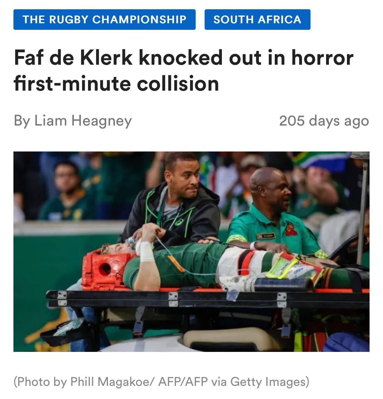 Rugby Pass: Faf de Klerk knocked out in horror first-minute collision